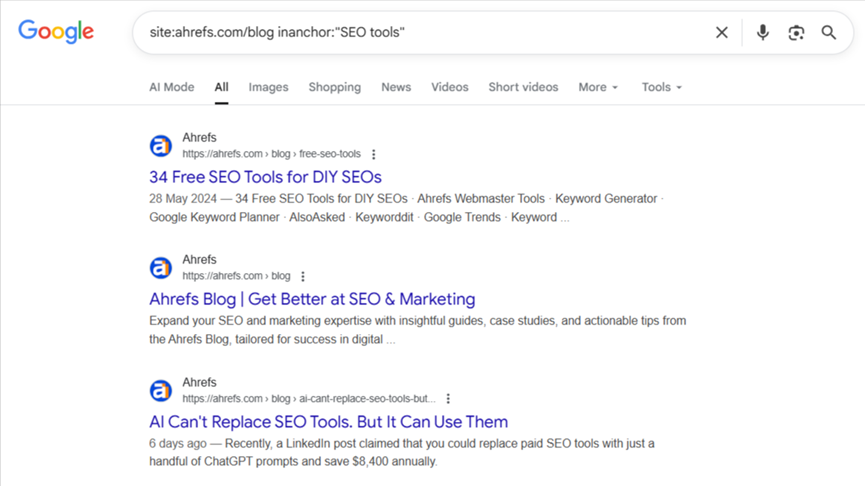 How are other sites linking to your competitors? This operator helps you find pages that use a specific anchor text in their links. It's perfect for reverse-engineering backlink strategies and improving your own internal linking.