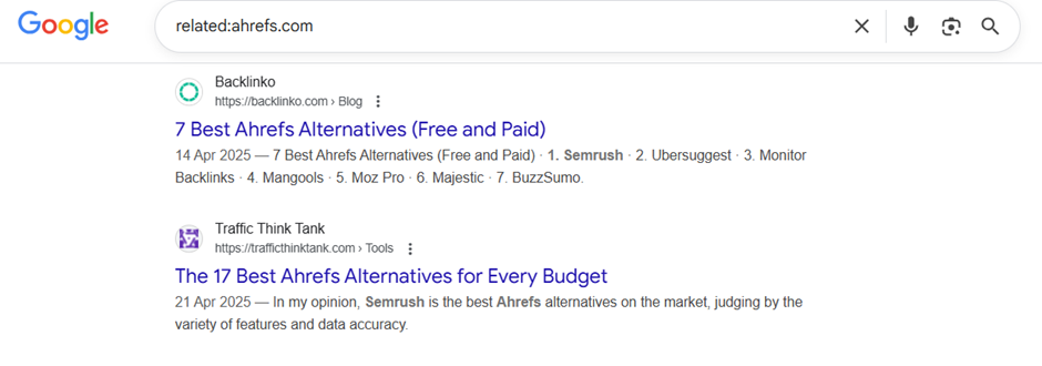 Who does Google see as your direct competition? The related: operator reveals websites that Google considers similar to yours, which can uncover competitors you didn't even know you had.
