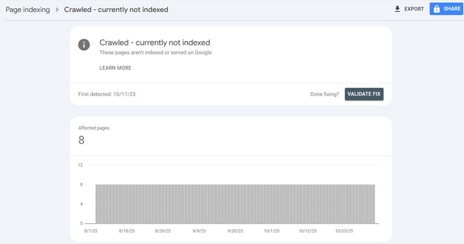 • What It Means: This is a more concerning status. Google crawled the page but made a conscious decision not to index it. This is typically due to quality issues, thin content, or it being a near-duplicate of another page.