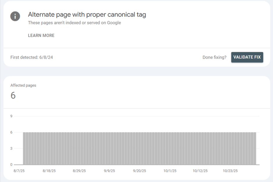 • What It Means: This is often not an error! It menas you have correctly implemented a canonical tag on this page, pointing to another URL as the main version. Because It's an "alternate" page, Google is correctly not indexing it.